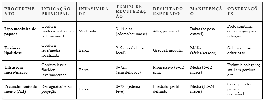 As opções incluem lipo mecânica de papada (aspiração com cânula), aplicações com enzimas lipolíticas, ultrassom microfocado/macro focado para colágeno e redução de gordura leve, toxina botulínica para bandas platismas selecionadas e preenchimento de mento com ácido hialurônico quando o problema é falta de projeção.